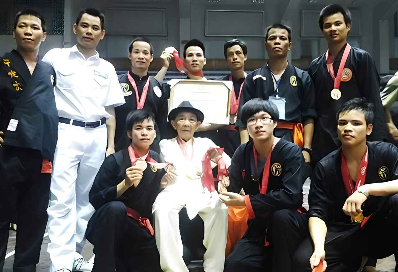 Cố võ sư Trần Hưng Quang (ngồi giữa) và các học trò; Võ sư, trọng tài quốc tế Đặng Tam Thuận (áo trắng đứng bên trái)