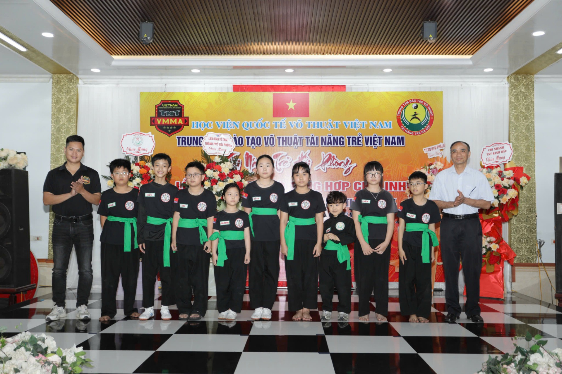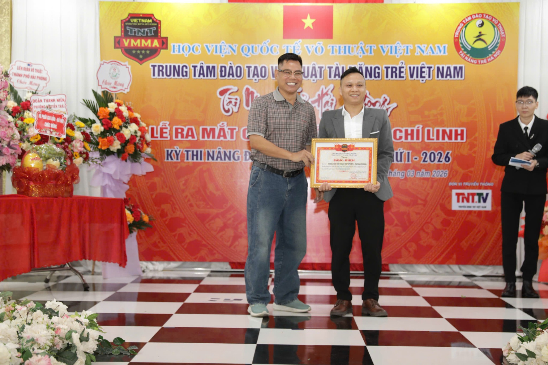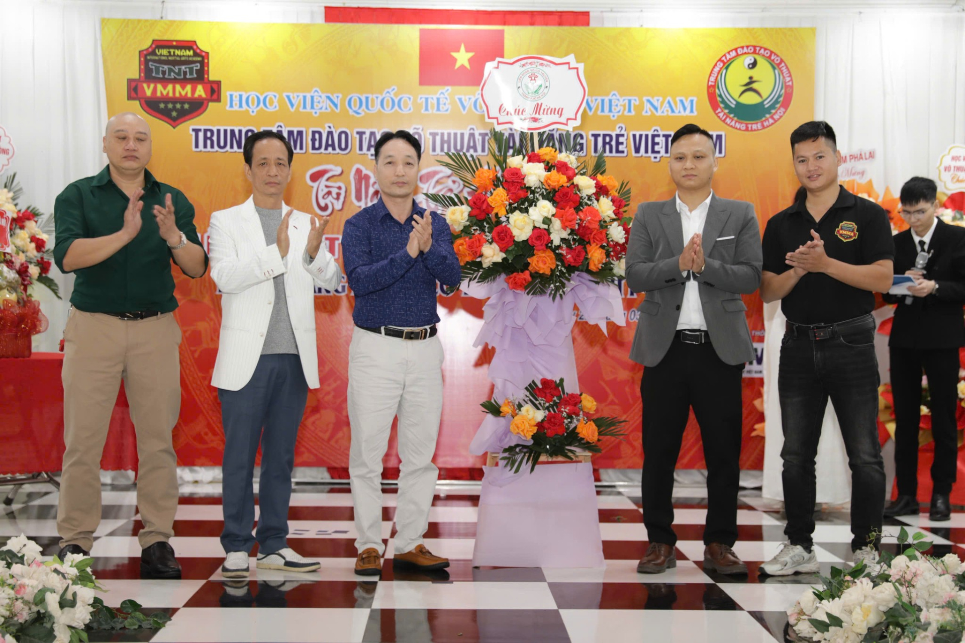 Võ sư, Trọng tài Quốc tế Đặng Tam Thuận - Chủ tịch Sáng lập Học viện Quốc tế võ thuật Việt Nam (vest xám) tặng hoa chúc mừng Võ sư cao cấp: Dương Đình Lộc - Chánh Thanh Tra Học viện Quốc tế võ thuật Việt Nam, Trưởng Chi nhánh Tài năng trẻ Kinh Bắc - Võ đường Dương Đình